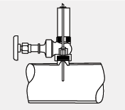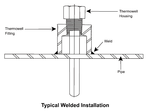 When properly installed, the pressure is sealed off by the Thermowell Housing and the temporary valve can be removed. A wide variety of thermowell housings can be installed into any type of piping. In this particular case, the piping is steel and the Thermowell fitting is welded to the pipe. With non-weldable pipe a bolt-on saddle may be supplied.